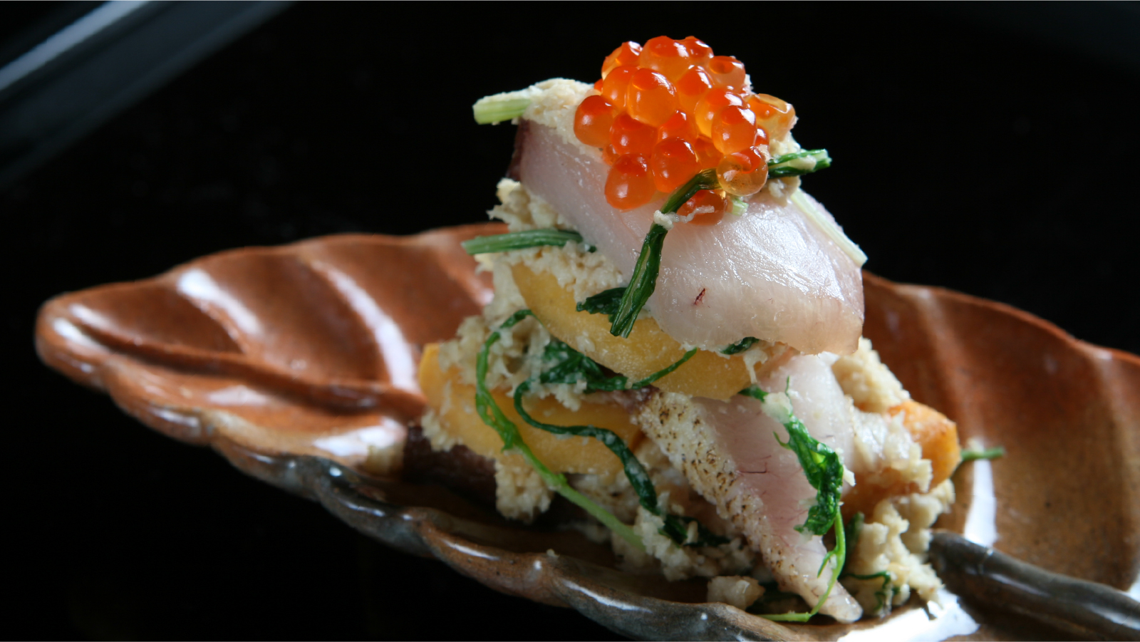 【先 付】利休鰤霙和え、柿、水菜、いくら