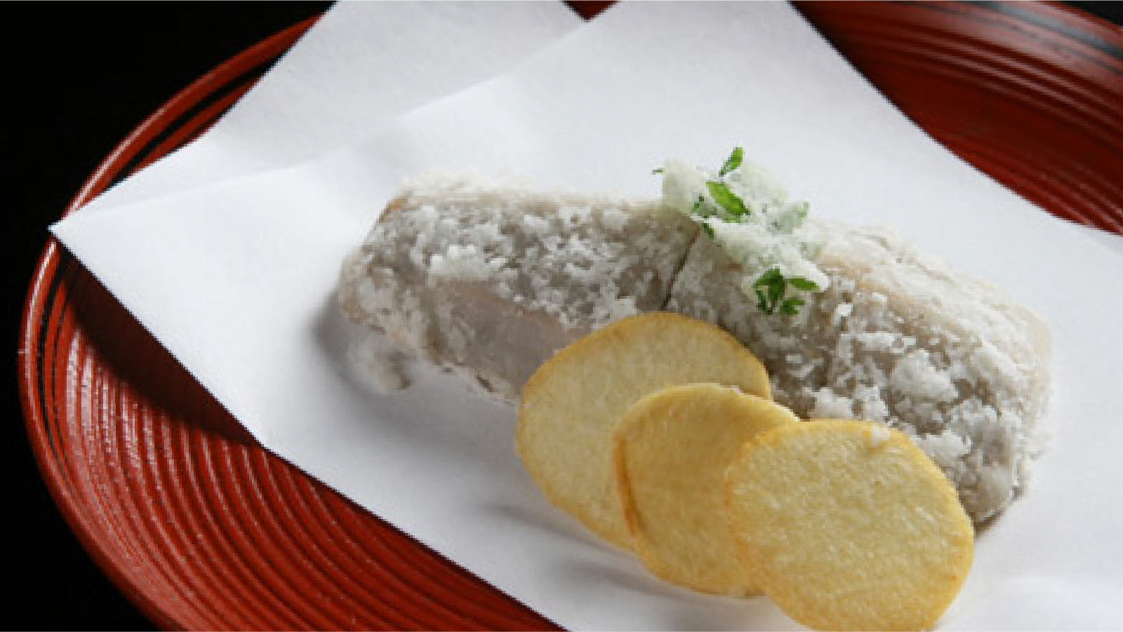 【揚 物】海老芋雪揚げ、木の芽、慈姑煎餅