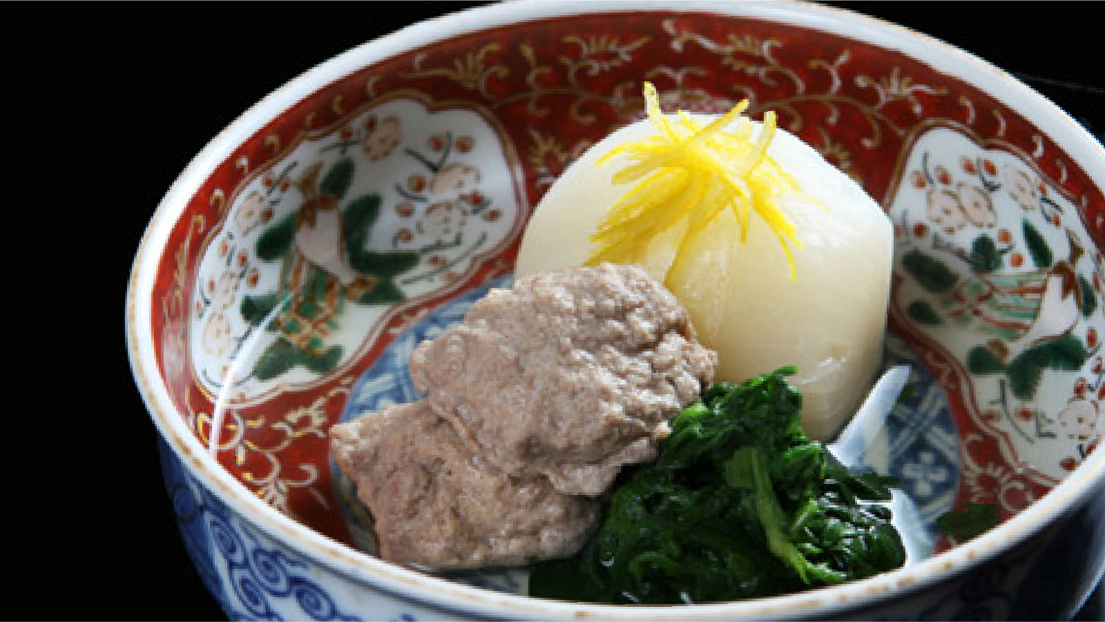 【焚合】小蕪、鶉たたき寄せ、菊菜、針柚子